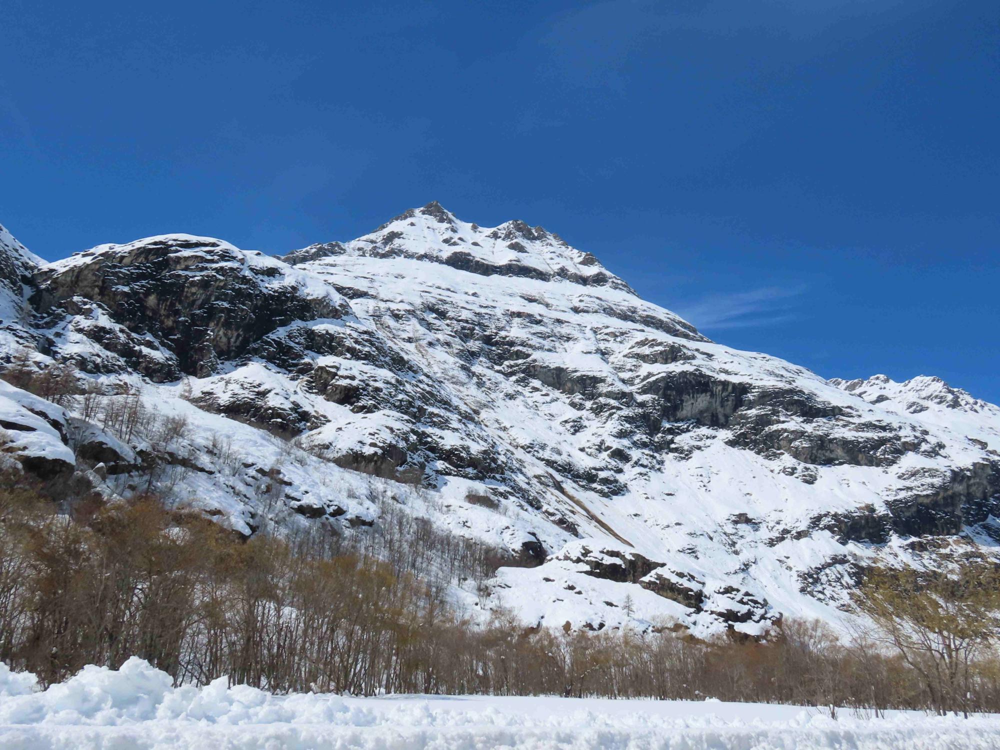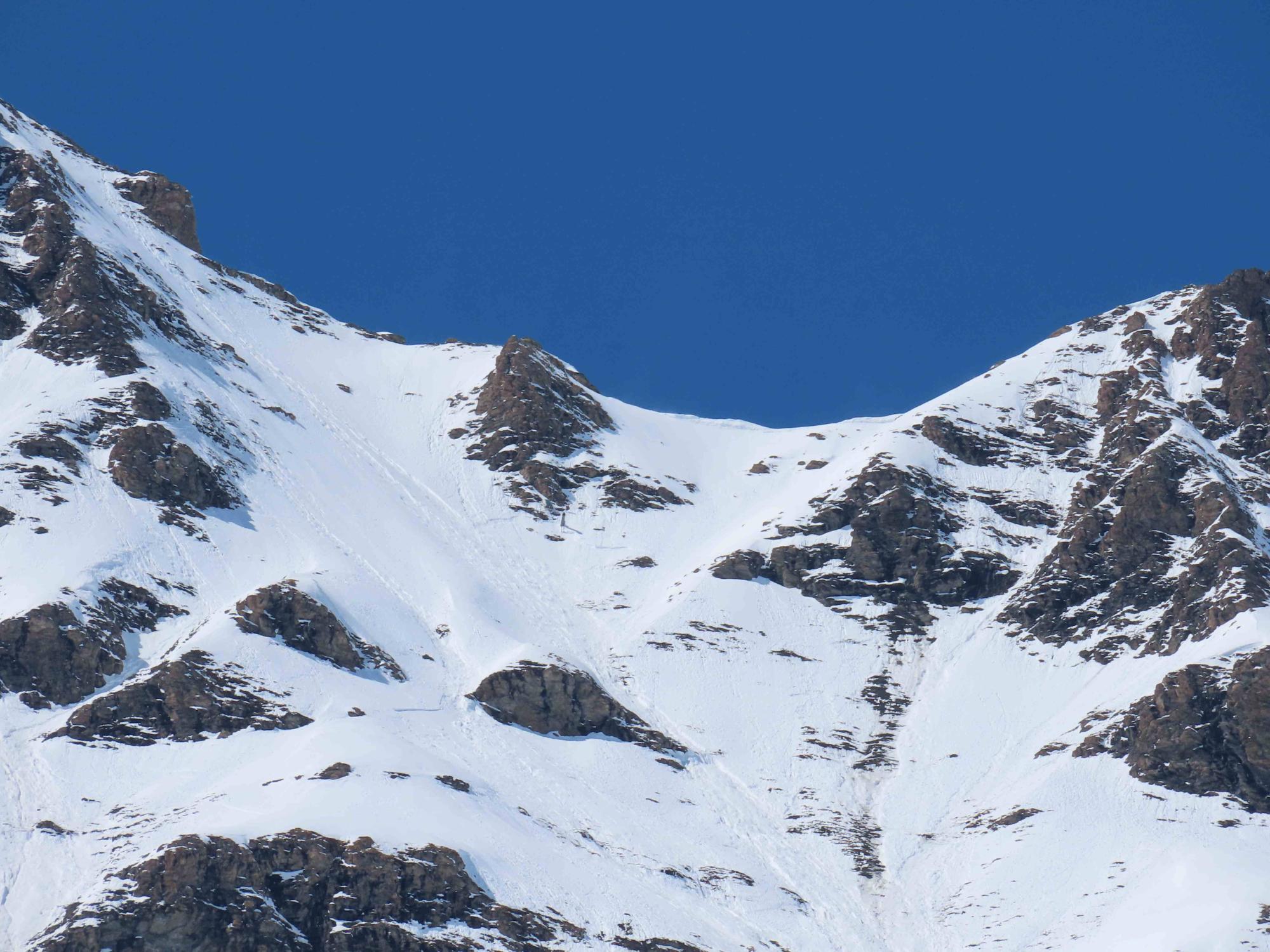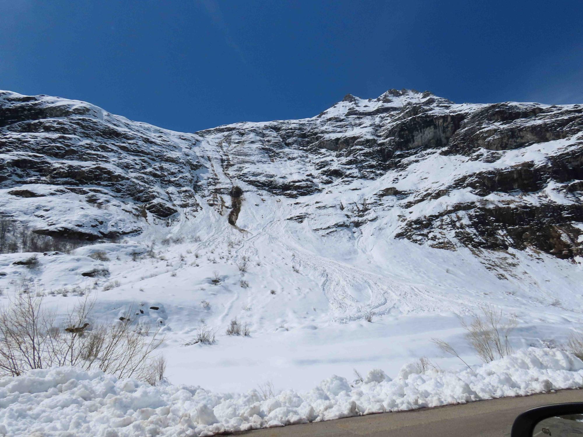 Nombreux départs de plaques majoritairement superficielles, d'ampleur modestes mais dont certaines ont quand même fini par approcher l'Arc. - Enjeux : RD 902 Bonneval - Bessans (Approché)