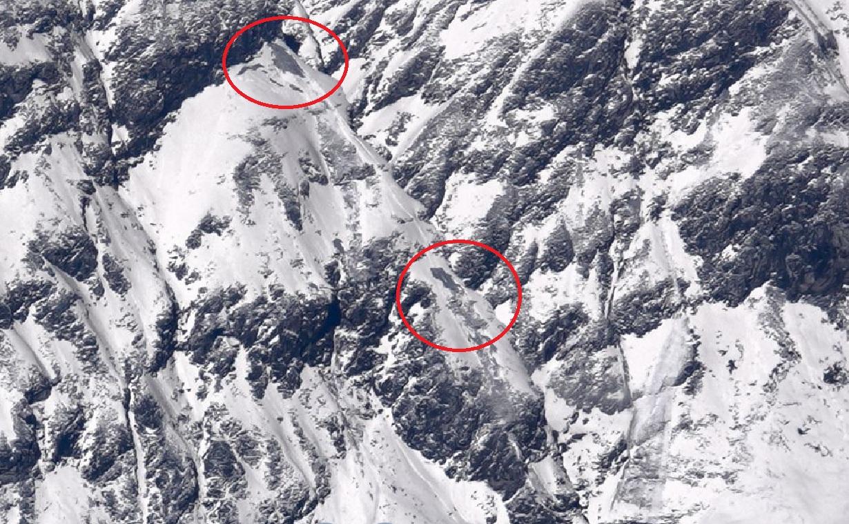 Départ spontané (entre 11:00 et 12:00) de quelques plaques de fond de faible ampleur, suite aux précipitations des jours passés puis au redoux en cours. - Enjeux : RD 902 Lanlevillard-Bessans (Zone de départ)