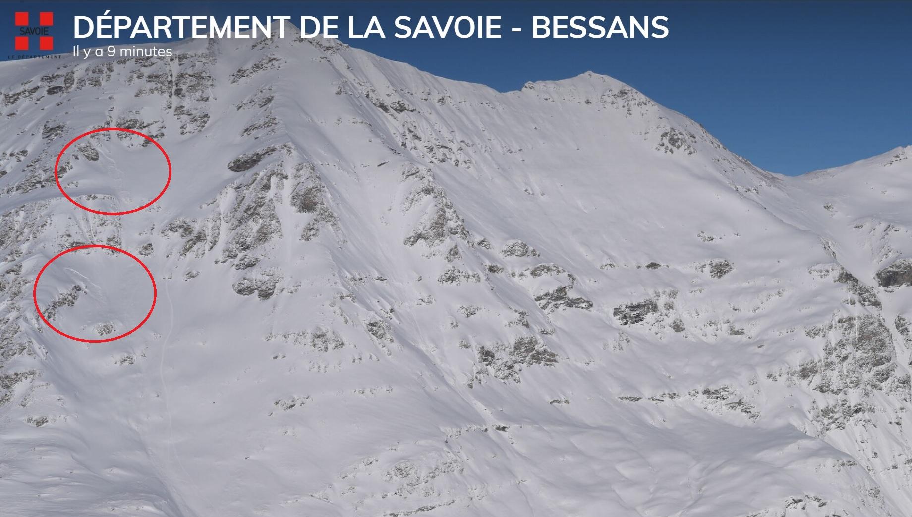 Départs spontanés probablement en, fin de nuit de samedi à dimanche. Plaques d'ampleur modeste. - Enjeux : RD 902 Lanlevillard-Bessans (Zone de départ)