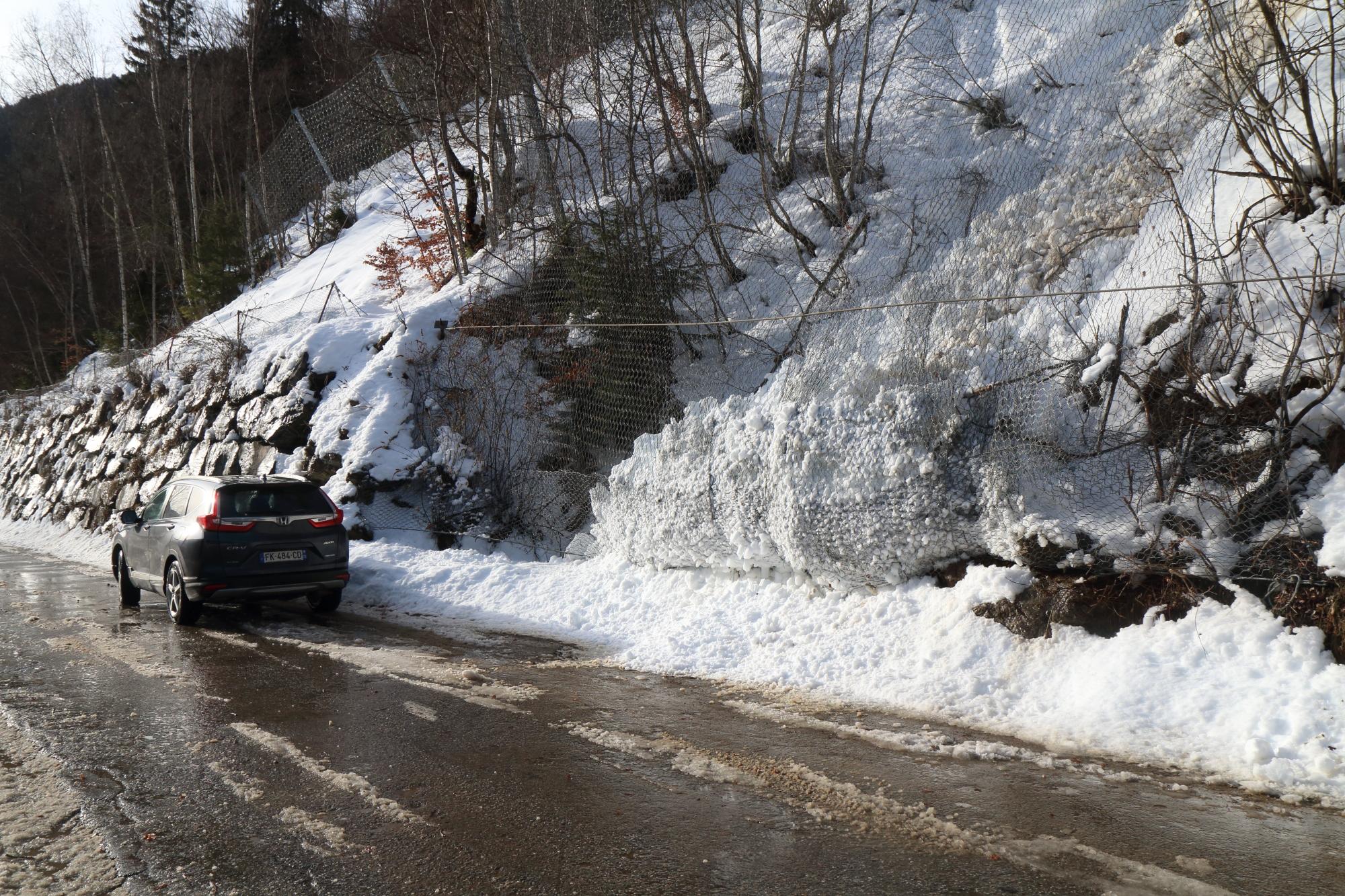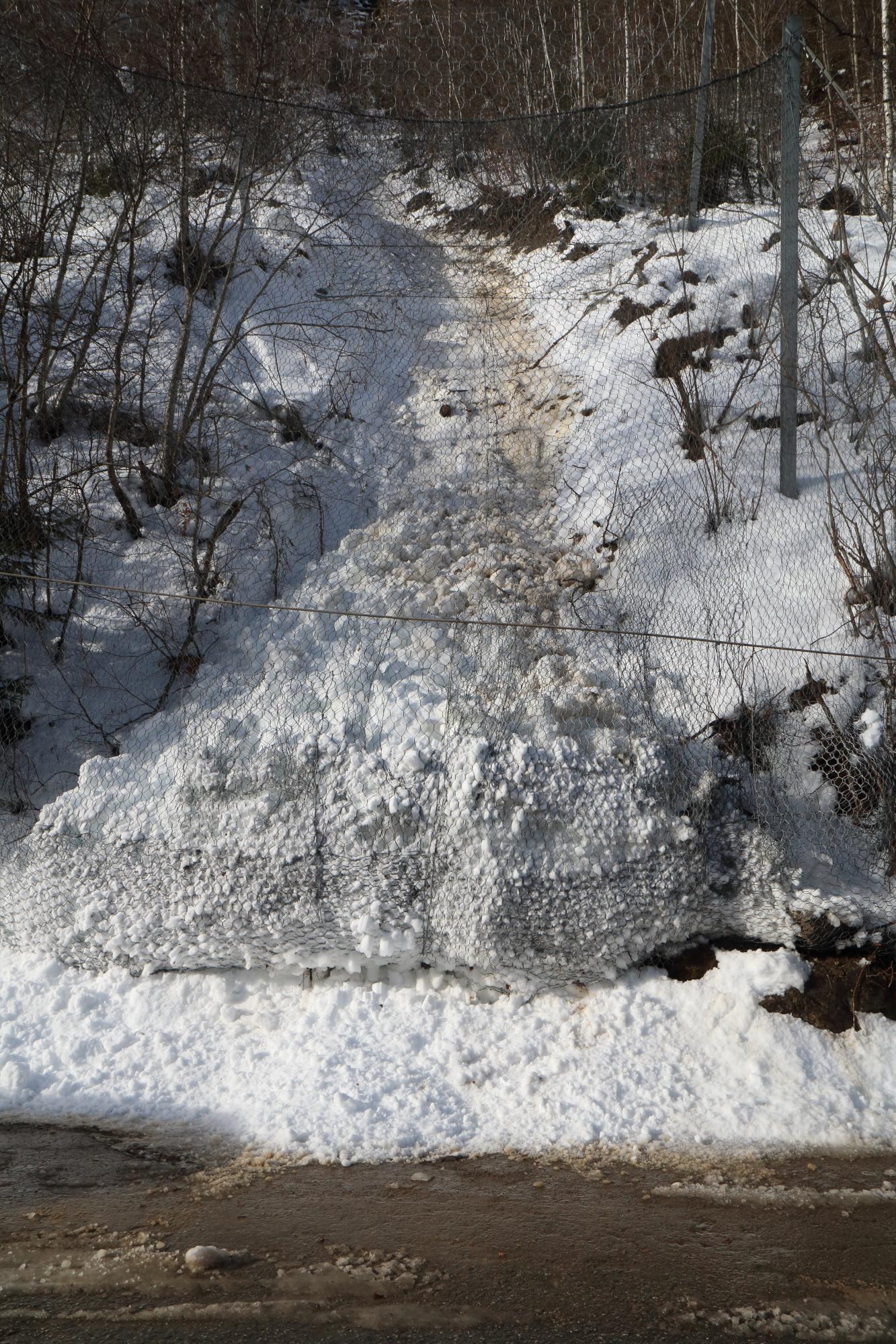 Coulée de fonte bloquée par le filet de protection juste en amont de la chausée - Enjeux : RD 213 (Approché)