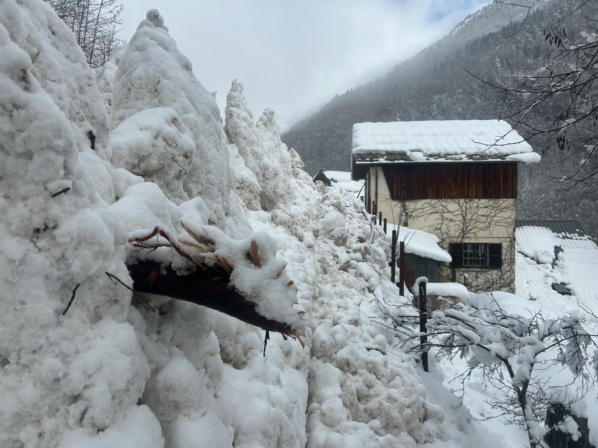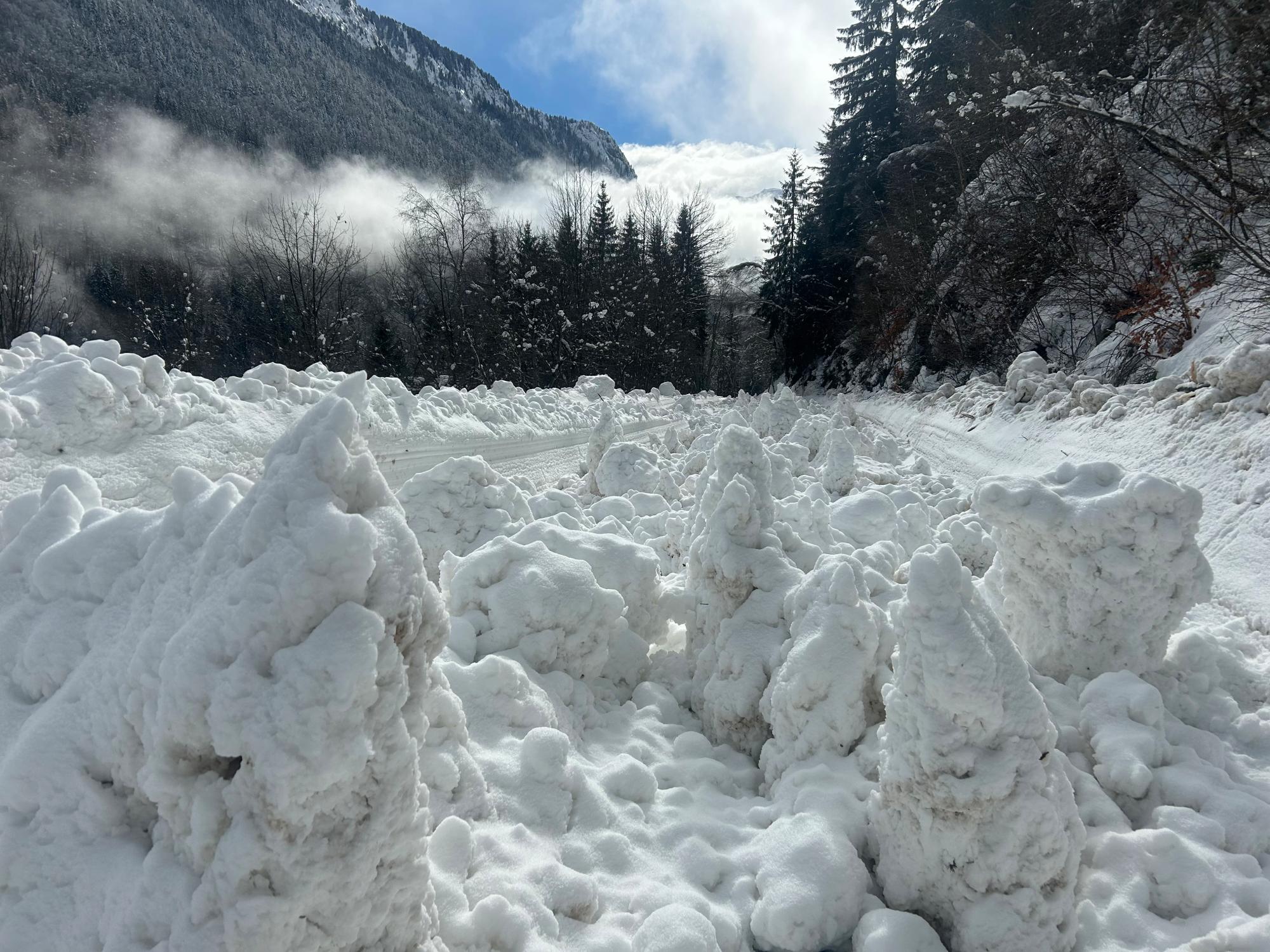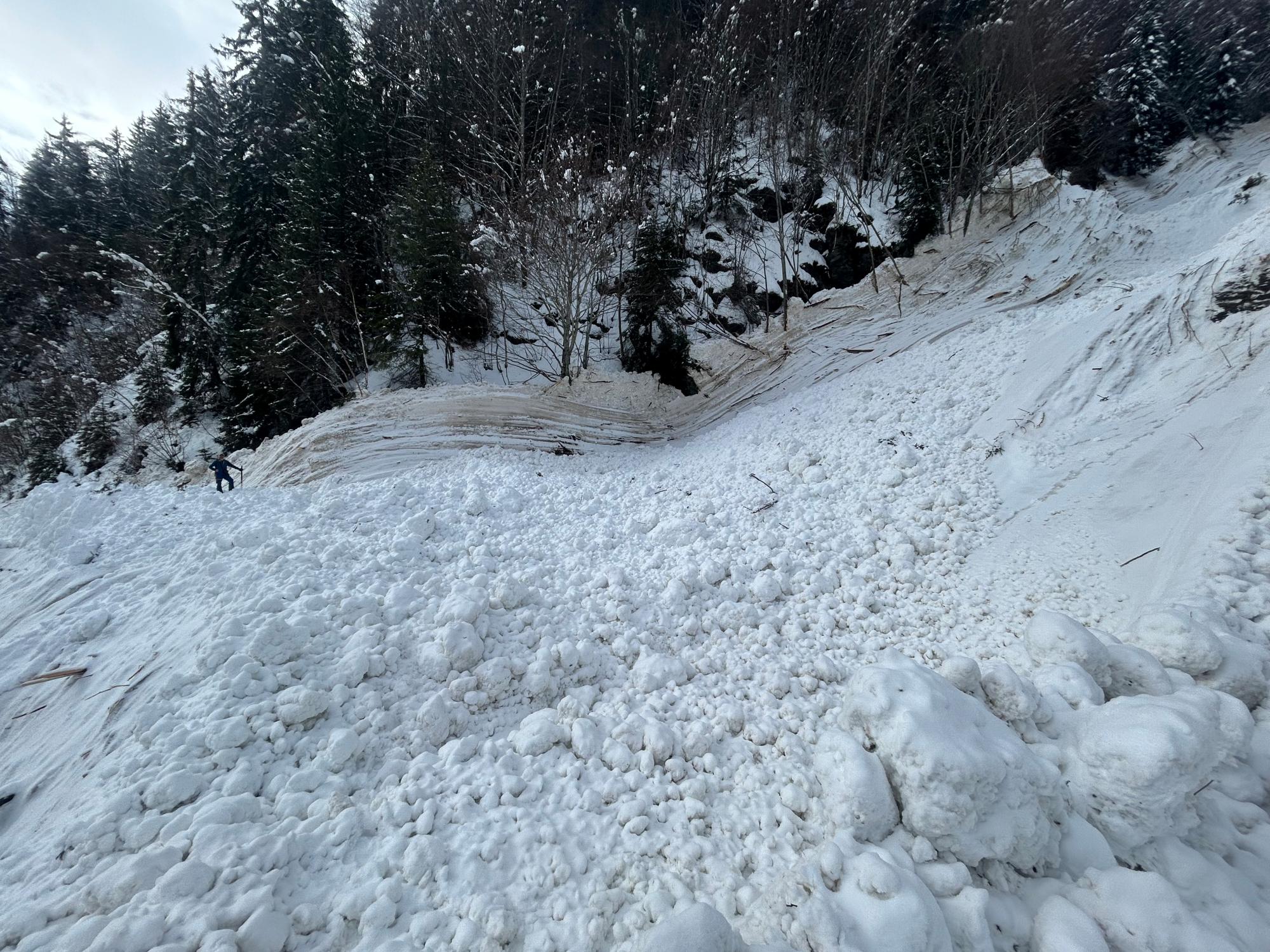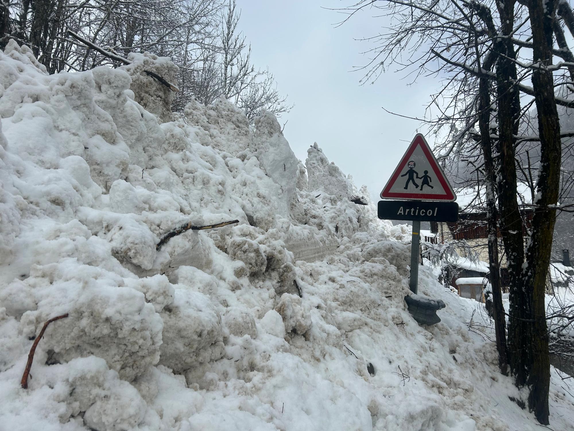 Avalanche d'ampleur exceptionnelle partie spontanément dans la nuit. Le dépôt s'est divisé en 2 au niveau de la route. Une partie a fini sa course en fond de vallon, et au autre partie a suivit la route jusqu'au hameau d'Articol (environ 1,5km).