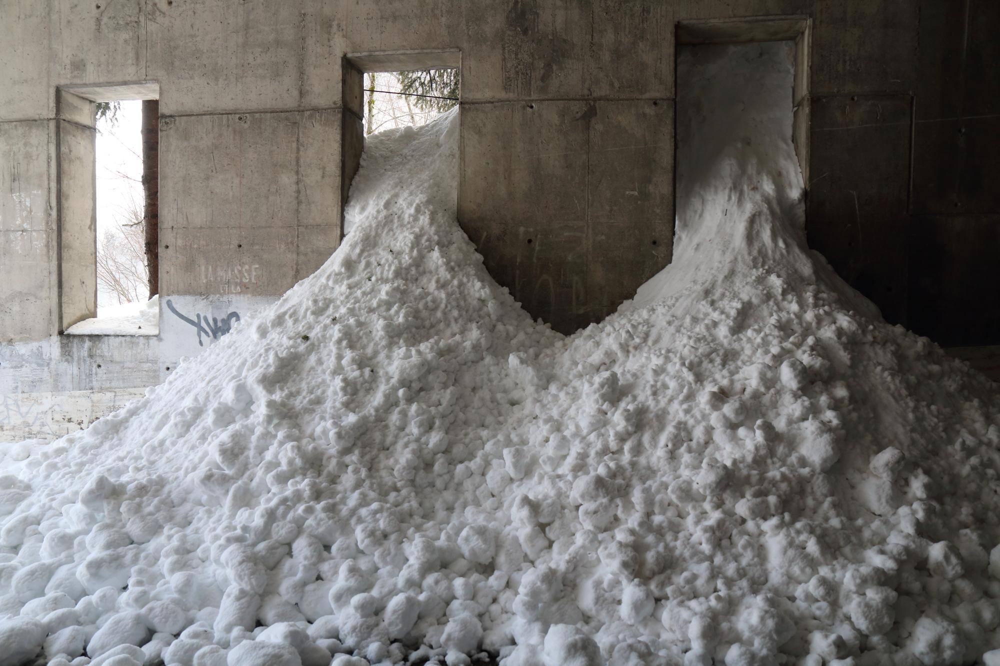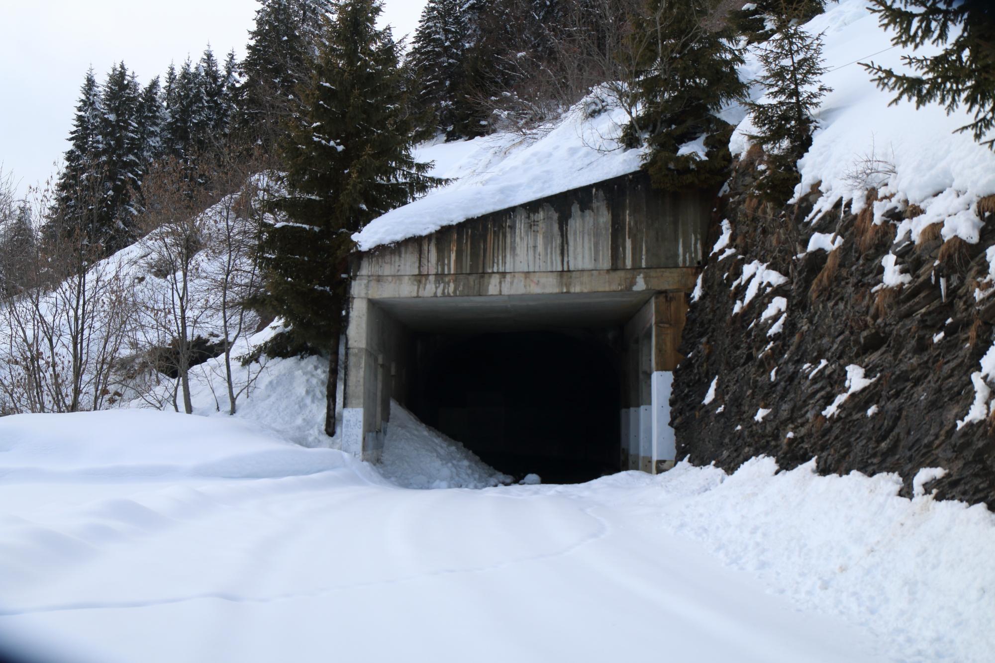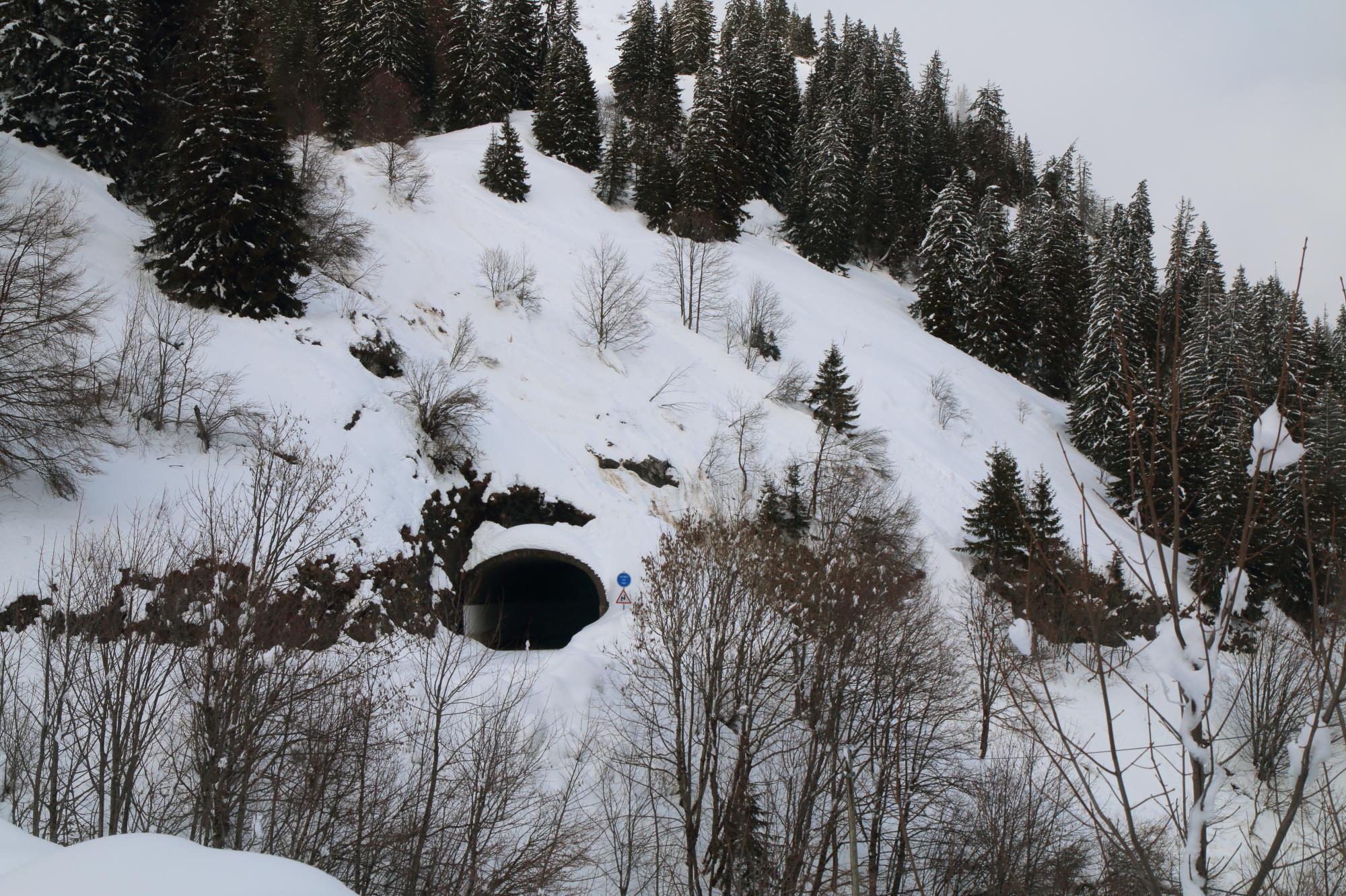 Dépôt résultant d'un départ spontanée en cours d'épisode perturbé, pendant la période de fermeture préventive de la route. Une partie de l'écoulement est entrée par les ouvertures de la galerie paravalanches. - Enjeux : RD 909 Col des Aravis (Traversé)
