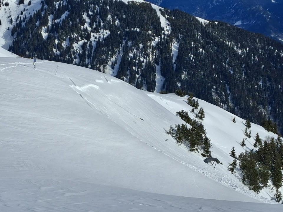 Plaque partie au déclenchement gazex, et initialement repérée grâce au décroché de hauteur de neige sur la mesure du capteur déporté de la station Flowcapt. - Enjeux : RD 213 (Zone de départ)