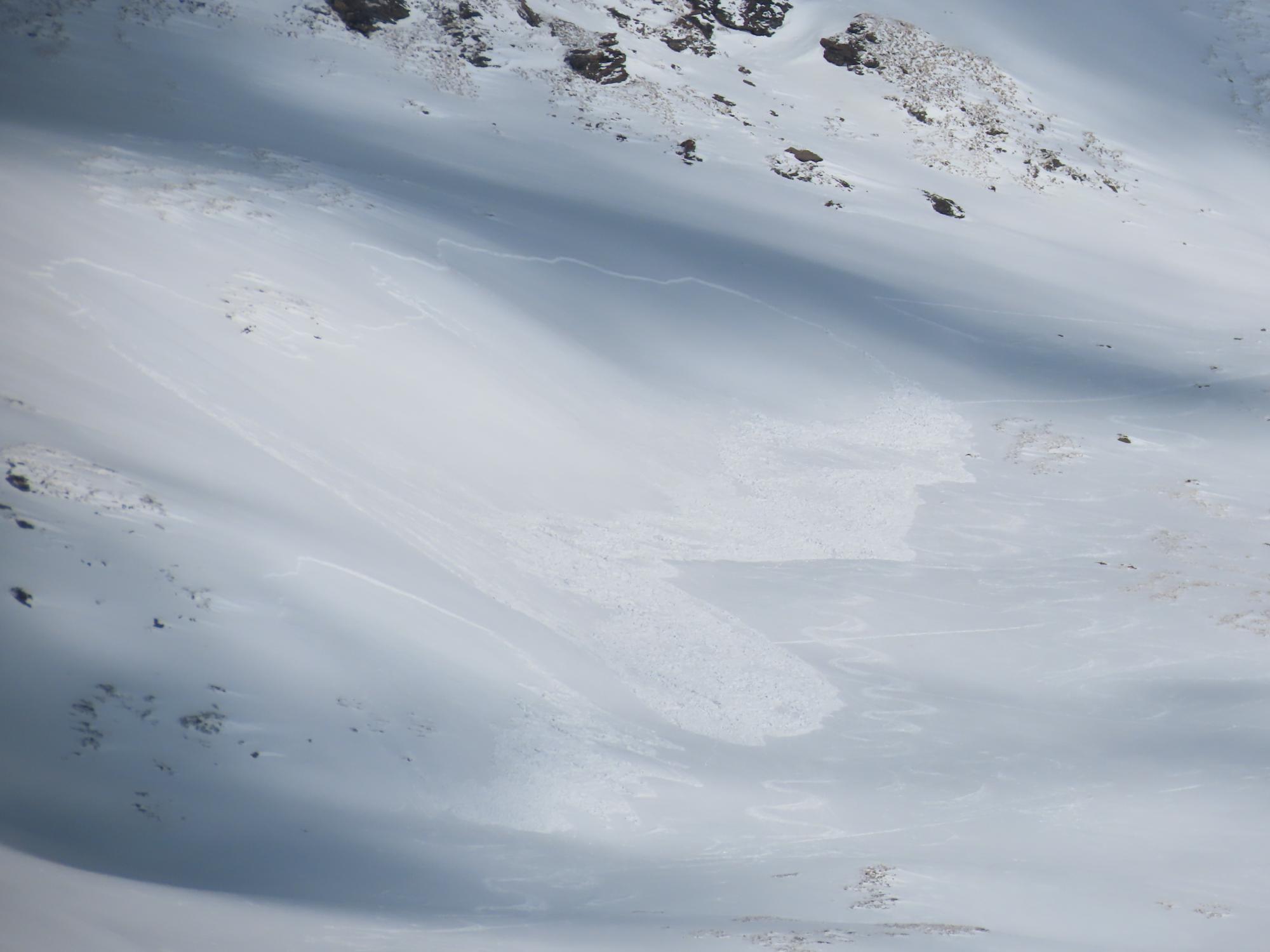 Plaque superficielle, formée suite à faible précipitations et fort vent. Déclenchement peut-être accidentel (trace à proximité) ? - Enjeux : RD 902 Tignes (Zone de départ)